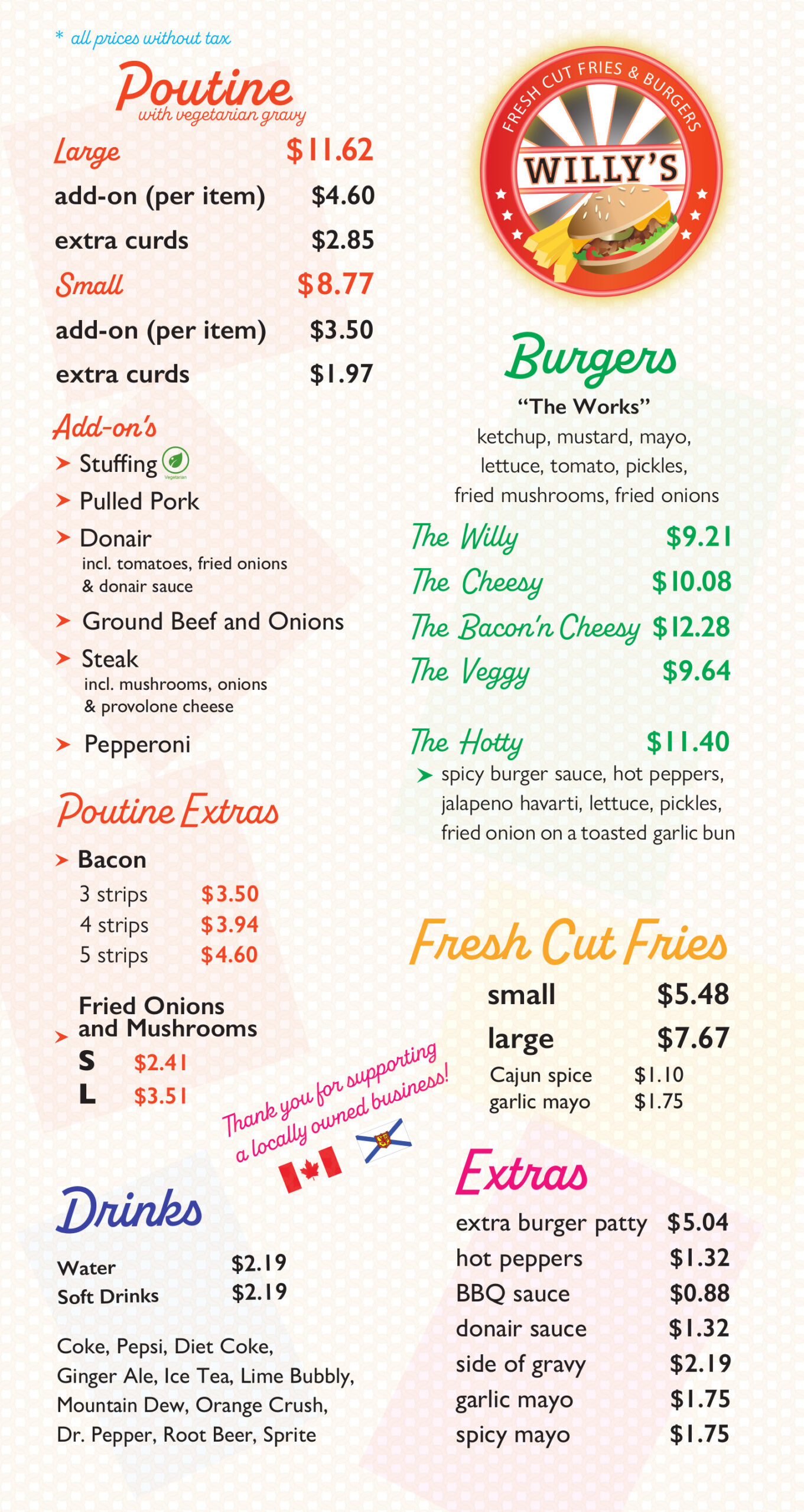 Willy’s specializes in great poutine, hand cut french fries, handmade Hamburgers and stays open late.